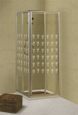 Mampara angular de ducha de dos hojas fijas y dos correderas. Apertura en vértice. Disponible en acrílico y cristal. Cristal de 4 mm securizado. Disponible en acabados transparentes, mate, carglass y serigrafías. Piezas de unión entre perfiles pueden ser en blanco, negro o cromo. Altura 190 cm. Fabricación a medida. |