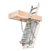 Escalera escamoteable de aluminio. Formada por 2 tramos, al igual que la escalera de dos tramos de madera, se caracteriza porque el primer tramo queda siempre sujeto a la tapa, mientras que el segundo se desliza por encima del primero, de modo que al bajarlo no ocupa prácticamente espacio por delante del cajón.