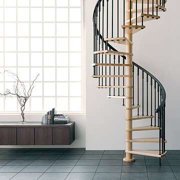 Escalera de caracol que combina la calidez de la madera con la barandilla metálica y el pasamanos de PVC, ambos de color negro. Esta combinación proporciona a la escalera una estética muy bella que aporta elegancia a cualquier espacio y crea ambientes acogedores y siempre actuales.